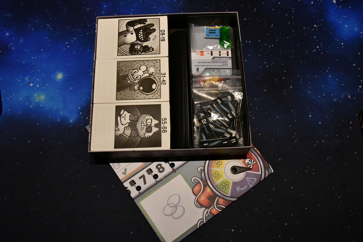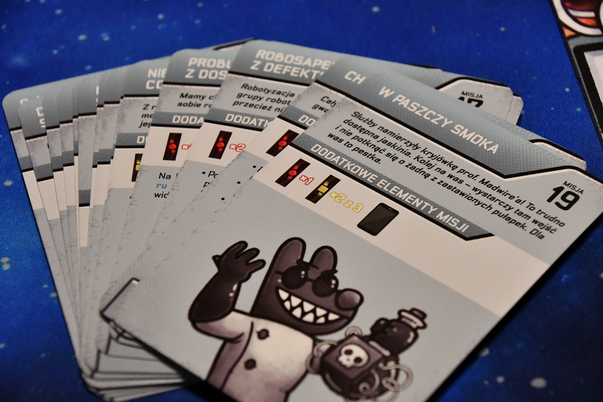 Nie ukrywam, że gra Bomb Busters jest nieco nieporęczna w temacie przygotowania rozgrywki. A wszystko dlatego, że jest to gra o przecinaniu kabelków i rozbrajaniu bomb. Każdy z graczy (w podstawowej wersji, bo gra ma charakter kampanii-legacy) ma przed sobą na podstawce szereg kafelków-kabelków o odpowiednich numerach, niebieskich, żółtych i czerwonych. No i trzeba je najpierw odpowiednio dobrać, potem przetasować, a na końcu rozłożyć tak, aby inni ich nie widzieli. Tasowanie kafelków jest jednak niewdzięcznym zadaniem, bo one lubią obracać się na tę stronę, która ma być ukryta. Potem już z górki - trzeba odpowiednio oznaczyć na planszy dodane kabelki żółte i czerwone, rozłożyć losowe karty sprzętu oraz nieco znaczników. W grze jest 66 dość różnorodnych scenariuszy, a część elementów jest ukryta w pudełkach i dochodzi w trakcie gry (o nich tu nie wspominam). Zatem trzeba też (na początku) wybrać scenariusz, w który gramy. Karty mają bardzo przyjemną kreskę, rysunki przedstawiającą pluszaki oraz sprzęt. To co mnie gryzie, to plansza główna (na której oznaczane są parametry gry), która wizualnie tu nie pasuje.