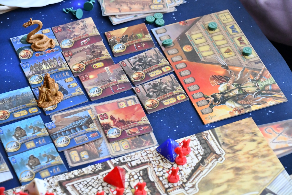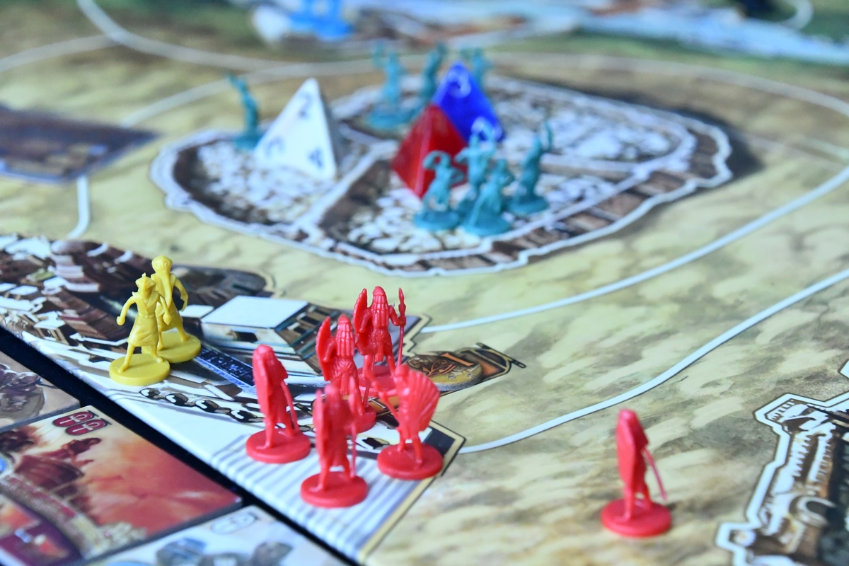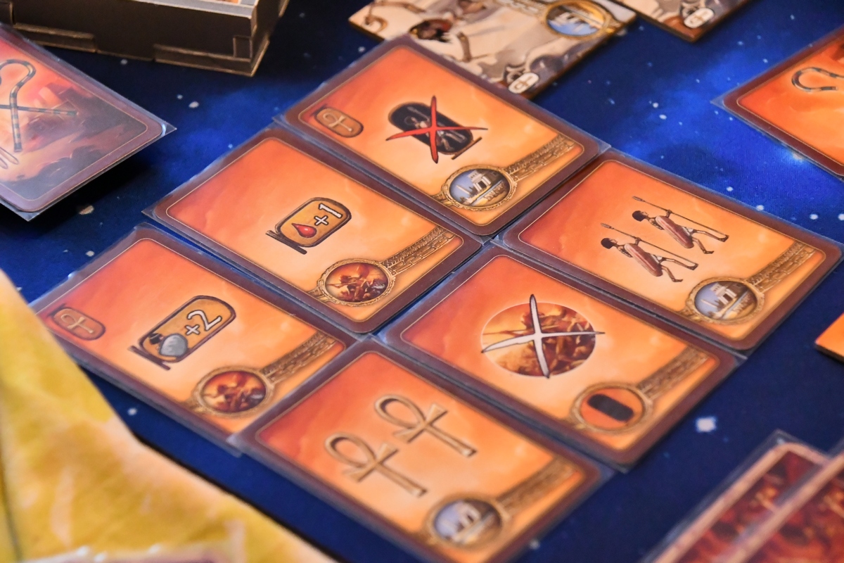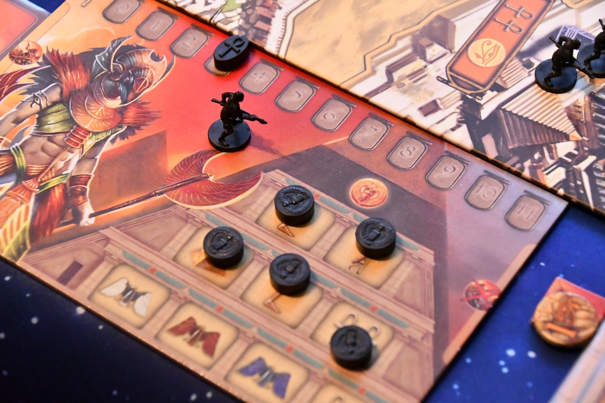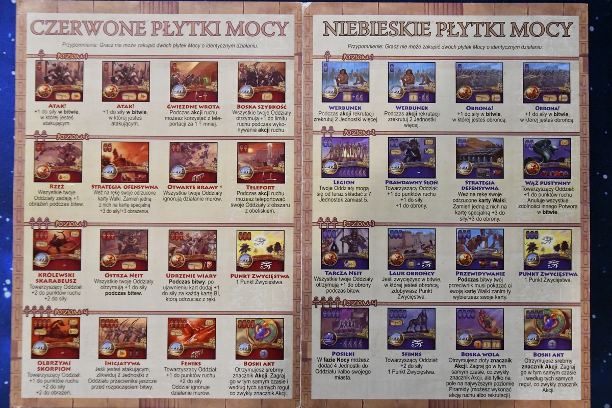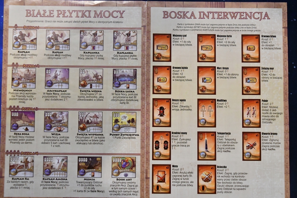 Gra składa się z naprzemiennych faz nocy i dnia. W nocy zarabiamy - otrzymujemy punkty modlitwy (czyli walutę w grze), karty z bonusami, zbieramy użyte dyski akcji i ustalamy kolejność gry. Natomiast w fazie dnia w pięciu kolejnych rundach każdy z graczy umieszcza dysk na akcji, którą chce wykonać (zyskać jeszcze nieco modlitw, podnieść poziom piramidy, kupić płytki mocy (trzeba mieć wcześniej piramidy w tym samym kolorze na odpowiednim poziomie), dodać jednostki do oddziałów i przesunąć swoje wojska. Jeżeli oddział wejście na pole z oddziałem innego gracza, rozstrzyga się bitwę. Każdy z graczy wykłada kartę walki + bonusy z posiadanych innych kart i płytek. Następnie porównuje się siłę graczy z kart i liczebności oddziałów. Na koniec zadawane są obrażenia i zdejmowane z planszy jednostki. Za udany atak dostaje się punkty zwycięstwa, tak samo jak za kontrolowanie świątyń, awansowanie piramidy na ostatni poziom i niektóre karty/płytki. I tam do momentu, aż pierwszy z graczy nie wygra. Jest tu więc dużo strategii, walki i negatywnej interakcji. Na plus na pewno czytelne akcje, które nie są trywialne - różnorodność płytek mocy i kolejność graczy ma znaczenie. Akcji nie ma też jakoś szczególnie dużo, więc początkowo działania wszystkich graczy są bardzo zbliżone.