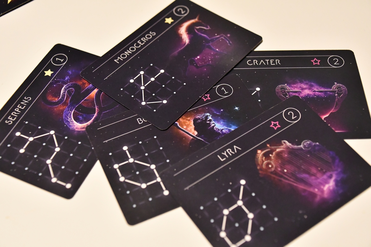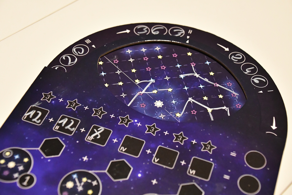 Wykreślanki ze swojej natury nie wnoszą za wiele interakcji między graczami. Tutaj również każdy dba o swoje konstelacje i tak kombinuje nanosząc je na mapę nieba, aby uzyskać jak najwięcej punktów. Pierwszym ruchem jest wybór karty przez aktywnego gracza, a następnie tej karty o tej samej wartości przez pozostałych graczy. Wartość oznacza liczbę gwiazd w konstelacji. Drugim ruchem jest narysowanie jej na swoim niebie, uwzględniając zasady punktowania (punktowane są określone kolory gwiazd, połączenia między tymi kolorami, gwiazdy wokół słońca, gwiazdy na obrzeżach oraz przecięcie linii ekliptyki. Trzecim ruchem jest podliczenie aktualnych punktów, obrócenie mapy nieba i przekazanie karty aktywnego gracza następnej osobie. I na tym w skrócie gra polega, każdy w skupieniu łączy u siebie punkciki na niebie. No ale grafiki do tych konstelacji są przecudne!