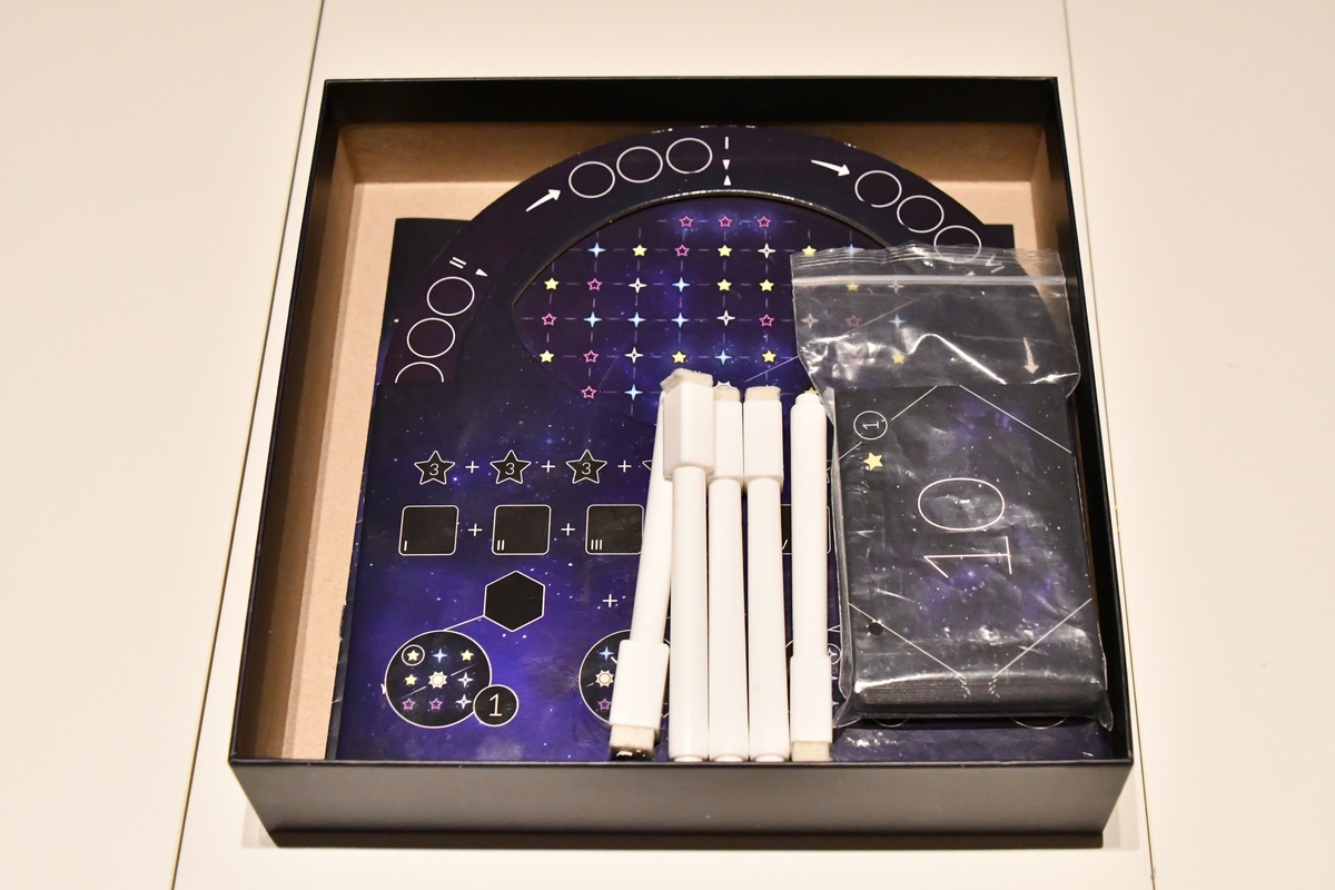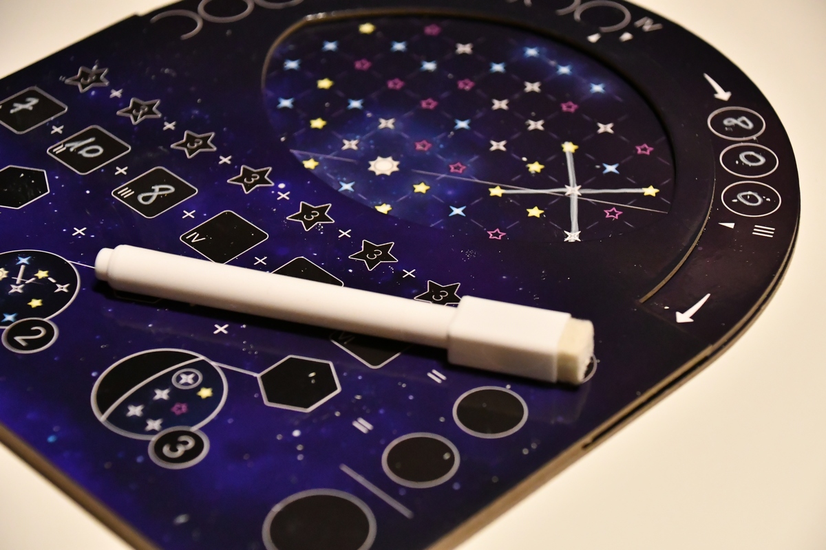 Odkrywcy nocnego nieba to w praktyce wykreślanka (z suchościeralną planszą). Każdy z graczy dostaje mapę nieba (złożona z dwóch części wchodzących w siebie), biały marker i zestaw losowych kart konstelacji. Do przygotowania nie ma nic więcej. Natomiast na grafiki, szczególnie konstelacje, można poświęcić jeszcze sporo czasu, żeby się w nie wpatrywać - bo są urocze. I ten wygląd to największy plus tej gry. Drugą z zalet jest czytelność zasad i prostota wytłumaczenia ich innym, po 2-3 minutach można zacząć grać.