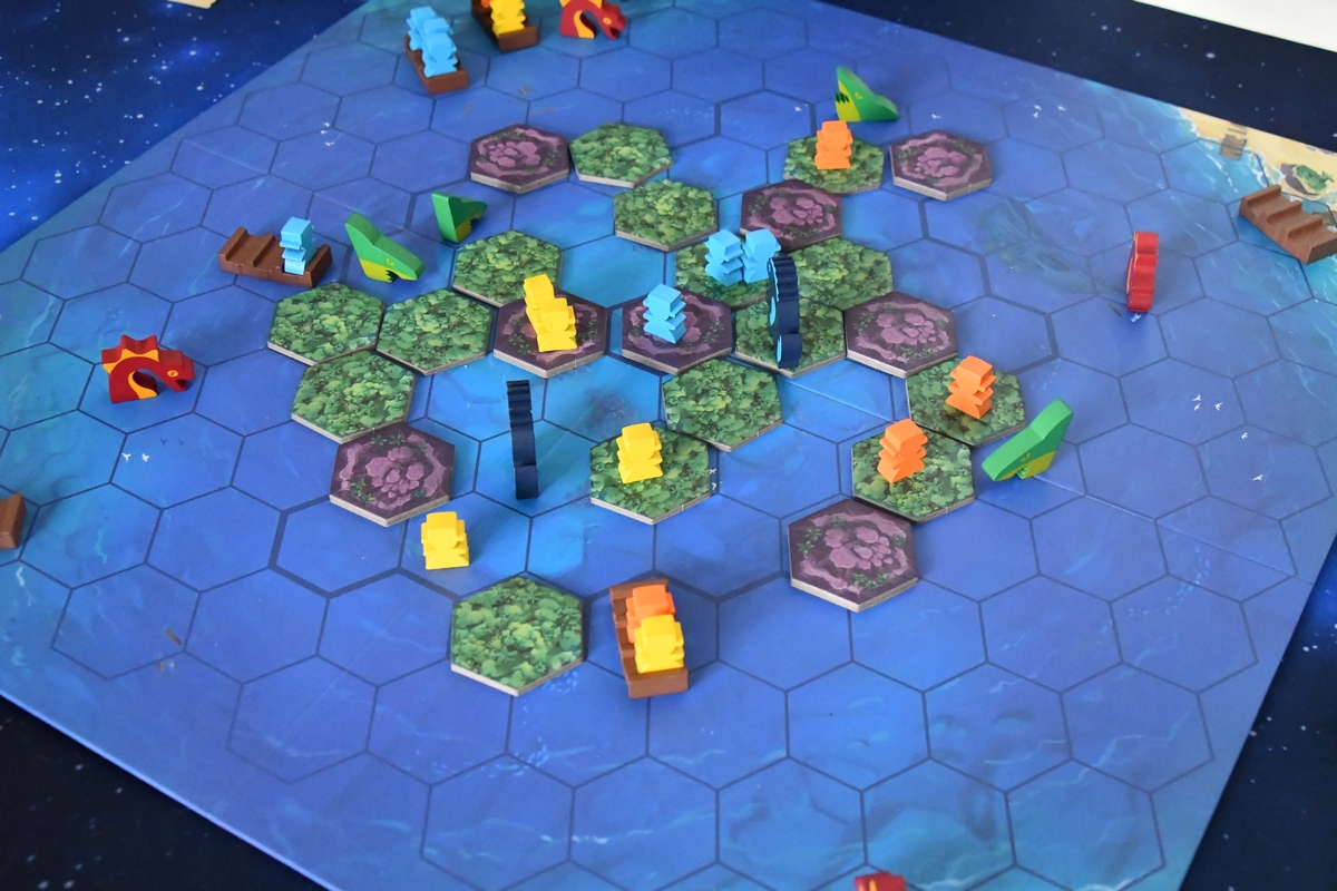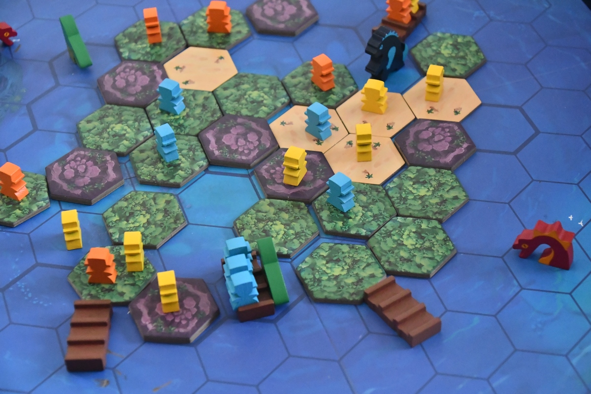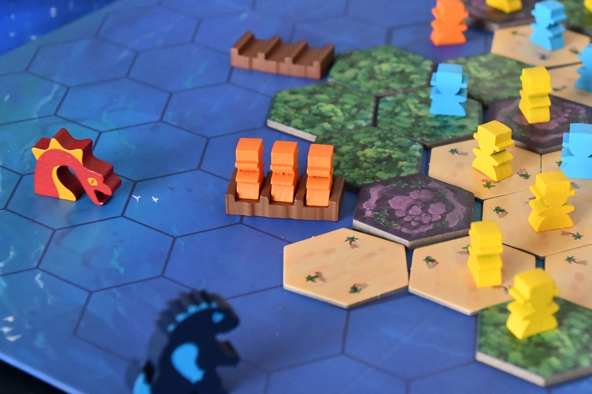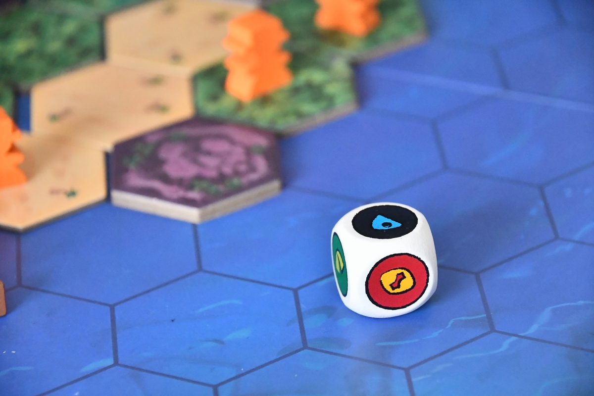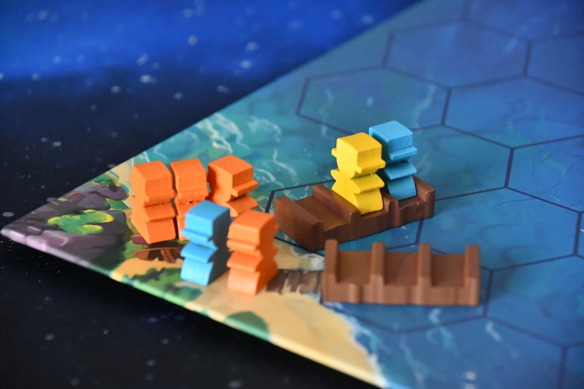 Grając w Survive the Island mamy w swojej turze trzy kolejne kroki, ale trzeba pilnować siebie i innych, by o którymś nie zapomnieć. Naszym celem jest uratować jak najwięcej pionków - poszukiwaczy - które rozrzuciliśmy po wyspie. Wartości odpowiadają skarbowi, który pionek niesie i ich suma wskazuje zwycięzcę. Czasem lepiej szybko uratować wysoko punktowane figurki niż skupiać się na wszystkich. Pierwszy krok to ruch pionkami. Potrafią one chodzić po lądzie i manewrować tratwą. Co prawda pływają też samodzielnie w wodzie, ale najsłabiej. Zatem najlepiej wrzucić swoich ludzi na tratwy i dopłynąć do jednej z czterech bezpiecznych przystani. Drugi krok to powolne zalewanie wyspy. Zabieramy kolejne kafelki, zaczynając od plaży, potem lasu, a kończąc na górach. Niektóre kafelki są negatywne i sprowadzają w ich miejsce potwory albo wiry, inne są pozytywne - te możemy zachować i wykorzystać (gdy na przykład będzie potrzebna pomoc delfina). I w tym momencie widać, że gra ma nieco negatywnej interakcji. Pionek, który stoi na zabranym kafelku, ląduje bowiem w wodzie. Będzie to raczej pionek przeciwnika. Trzeci krok to rzut kością i przemieszczenie wybranego przez siebie potwora. Tu negatywna interakcja wchodzi na całego. Bowiem na pożarcie tego topiącego się pionka wysyłamy rekina. Chociaż jest taki kaiju, który potrafi też pomagać, bo może przepchnąć pionki na pole bliżej tratwy. W każdym razie gra daje dużo emocji i rozgrywka jest bardzo dynamiczna. Jedyny minus jaki nam wyszedł w praktyce, to niewielka stabilność tratew - gdy ludziki z nich czasem wypadają, to widać jakie numery mają na spodzie. Ale gra jest u mnie w rankingu bardzo wysoko. Dobra regrywalność - za każdym razem będzie nieco inaczej. Wykonanie i czytelność zasad, klimat, emocje czy stosunkowo dobra cena, to wszystko jest na plus.