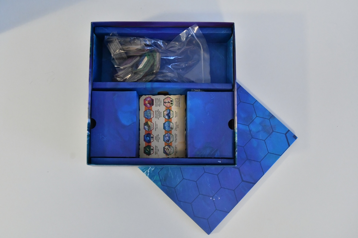 W grze Survive the Island (tytuł z jakiegoś powodu nie został przetłumaczony, mimo że sama gra została wydana po polsku) nie ma za wiele elementów. Jest plansza, kafelki które się na niej rozkłada, są figurki trzech gatunków potworów, są tratwy oraz po 10 pionków na gracza. Widać, że cała zawartość jest konkretna, masywna i dobrze przemyślana. Początkowo w pudełku była na to wszystko dopasowana wypraska, natomiast w ostatnich wydaniach postawiono na ekologię i znaczniki są w papierowych torebkach. Z rozłożeniem jest nieco zachodu, bo trzeba wszystkie kafelki rozłożyć losowo na mapie, a gracze potem rozkładają również wszystkie swoje pionki. Na każdym pionku jest na spodzie numer - i podczas jego wykładania jest jedyny moment, aby to zapamiętać - co jeszcze spowalnia przygotowanie. Każdy gracz otrzymuje też świetną kartę pomocy, na której przedstawiono chyba wszystkie zasady gry. Super! Czytelności nie brak też ikonom - bo na spodzie każdego kafelka jest informacja, co on robi. Przykładowo spray w butelce pozwala przepędzić smoka morskiego albo rekina.