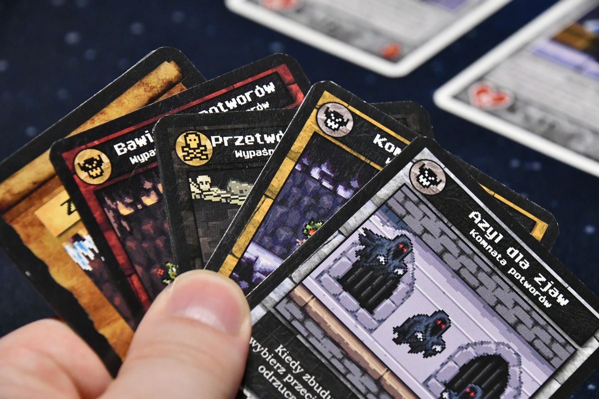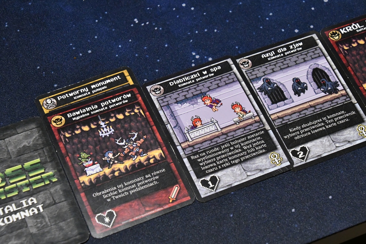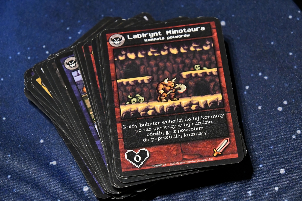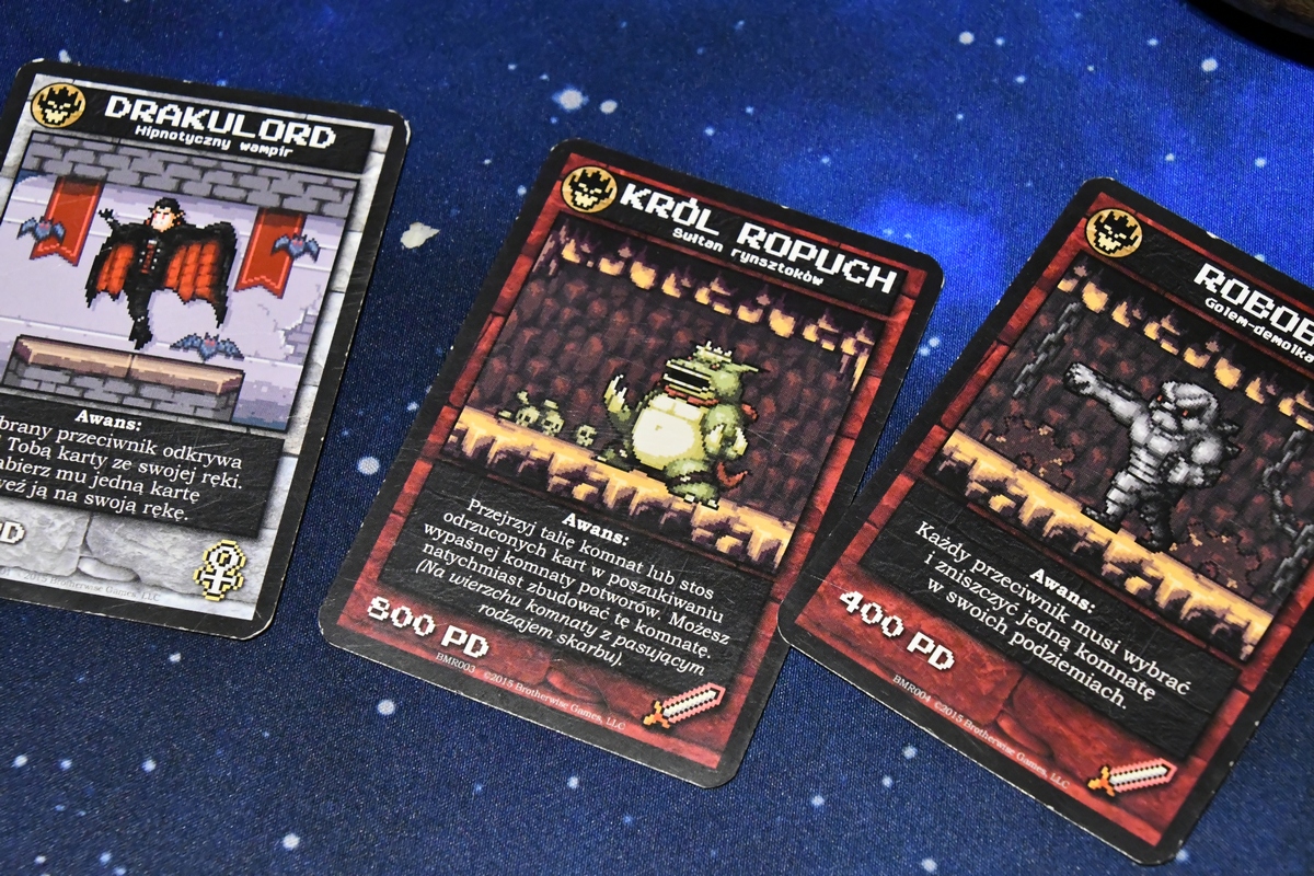Fabuła Boss Monster to odwrócony Dungeon Crawler. Jesteśmy jednym z potworów, które chcą ściągnąć do swoich lochów bohaterów. Wygra ten potwór, który pokona 10 śmiałków (lub nie zginie). Pierwszy etap to poznanie bohaterów danej tury (mag, rycerz, złodziej, kapłan), którzy szukają odpowiednich skarbów (księgi, miecza, złota, medalionu) i dobranie karty komnat. Drugi etap to rozbudowa naszych podziemi o jedną komnatę. W komnatach są skarby, więc trzeci etap to wskazanie graczy, do których pójdą bohaterowie. I wreszcie czwarty etap to pokonanie bohatera (pułapkami w komnatach) lub jego przeżycie i zadanie rany potworowi (ma 5 punktów zdrowia). To co słabo odczuwałem to nawiązanie do klasyki gier wideo. Właściwie trzeba się skupiać na dwóch elementach: liczbie ikon skarbów oraz wartości życia u bohaterów i obrażeń w komnatach. Po drugie gra jest dość monotonna: dokładam komnatę, ściągam bohaterów, liczę ile moje komnaty zadają obrażeń i zabieram tych bohaterów jako punkty. I znowu to samo. Po trzecie jest duży potencjał (i efekty) do negatywnej interakcji, ale dobieranie tylko jednej karty znacznie zwiększa losowość gry kosztem możliwości. Raczej to nie mój klimat.