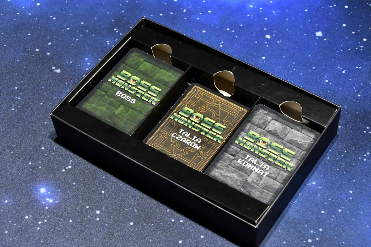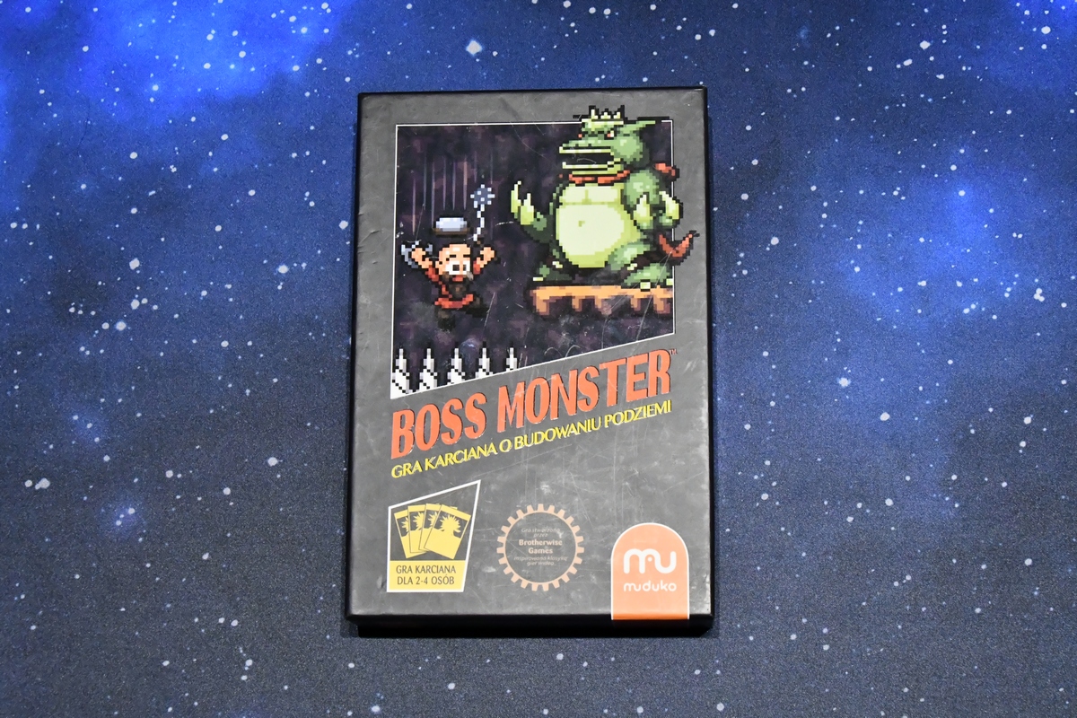 Gra składa się wyłącznie z kart, które są w dość rozsądnie podzielonym na przegródki pudełku. Z tym że takie papierowe przegródki nie są super wygodne. Aby rozłożyć grę, należy odrzucić karty przeznaczone dla większej liczby graczy, a następnie przetasować w poszczególnych stosach i dobrać 5 z 7 kart na rękę. Charakterystyczne w Boss Monster są grafiki nawiązujące do pierwszych gier na stare komputery (Atari, Commodore, Amiga) i przygotowane w ówczesnym rozpikselowanym stylu. Klasycznym przykładem jest chociażby Mario. Również wiele nazw postaci nawiązuje do popkultury, jednak zauważą to raczej gracze którzy wówczas byli dziećmi.