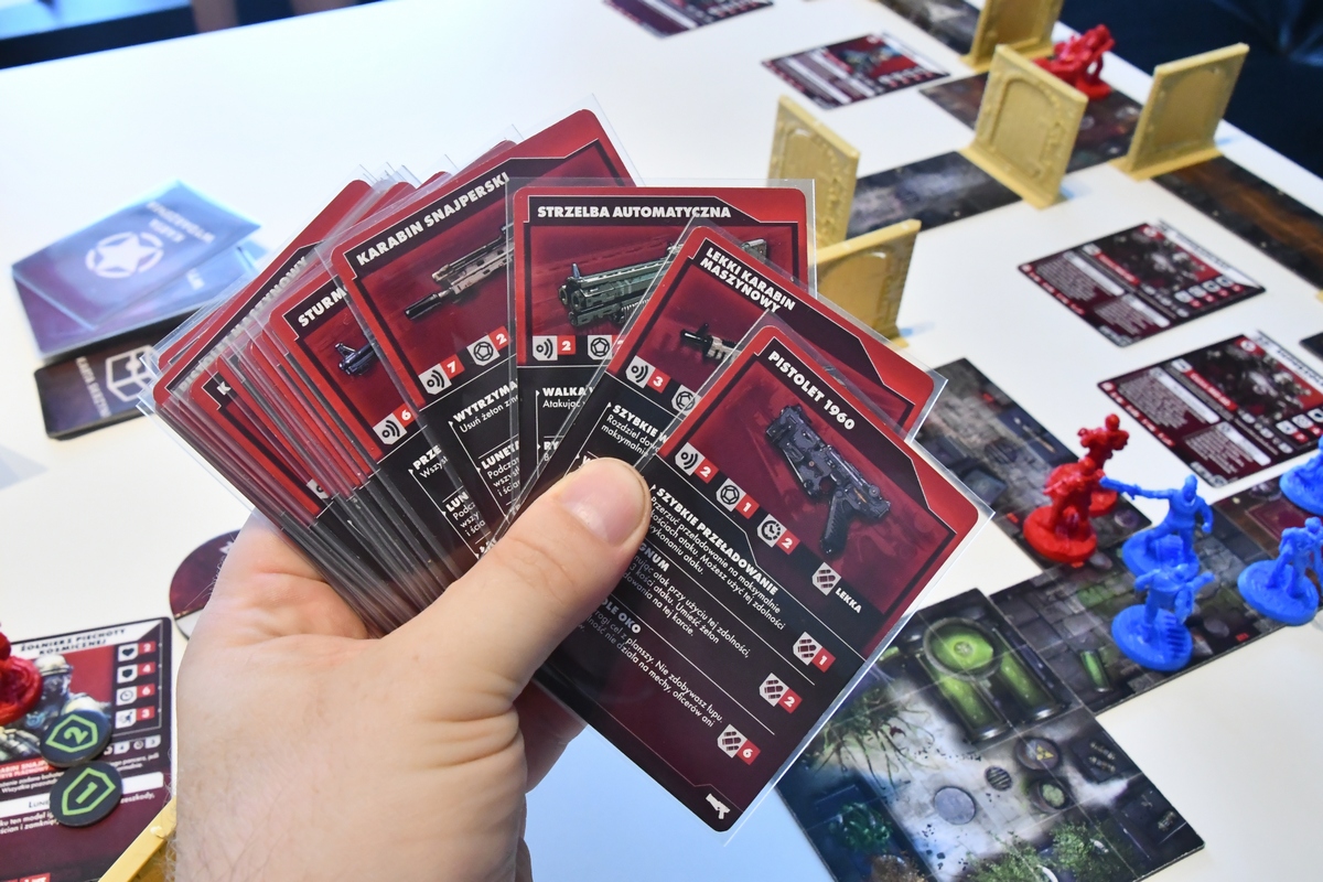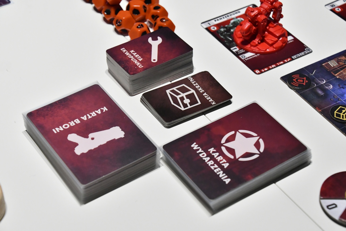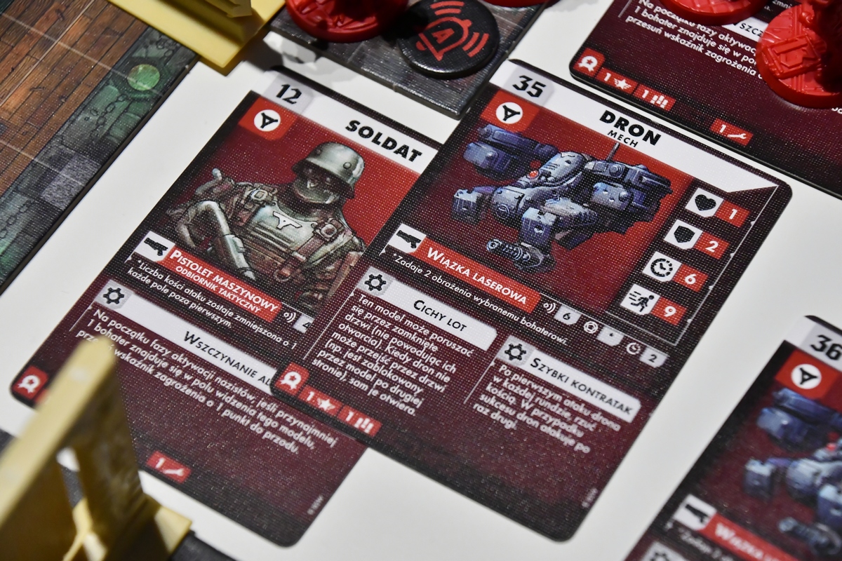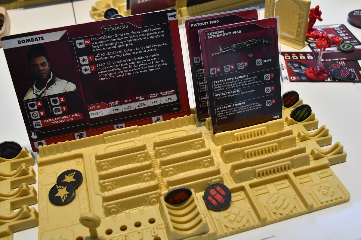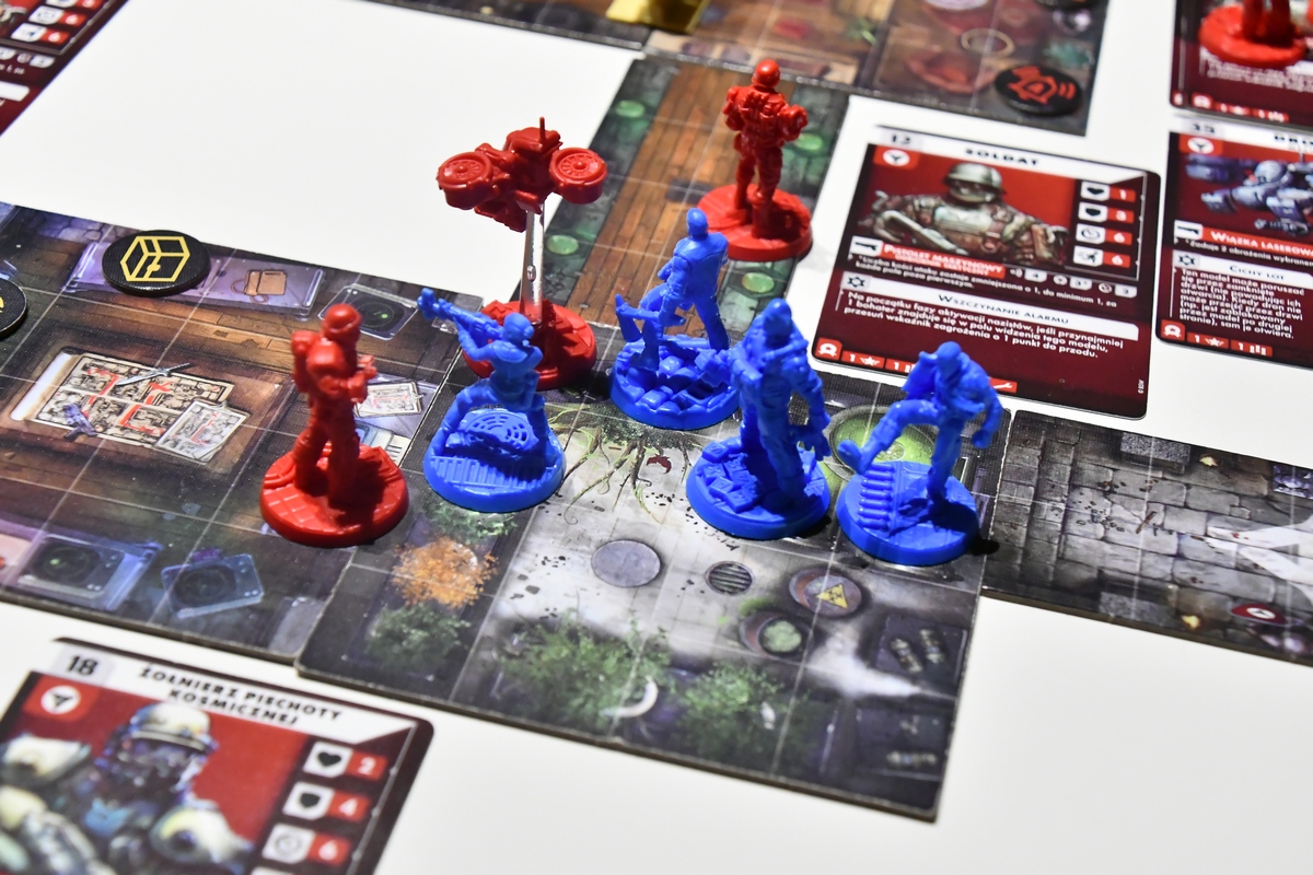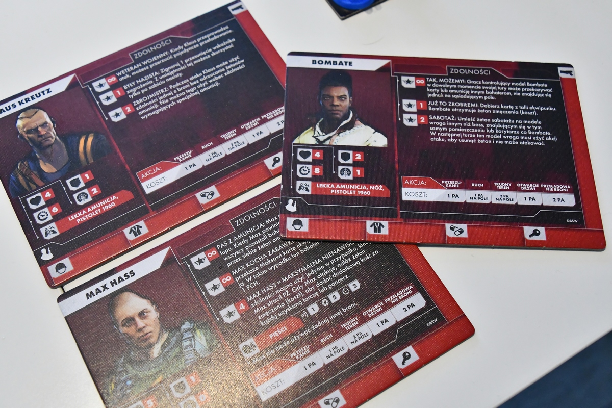 Niestety przygotowanie gry to męczarnia i trwa podobny czas jak sama rozgrywka. Przede wszystkim w pudełku jest multum figurek, które po zakupie gry należy... skleić. Przed samą rozrywką trzeba rozłożyć kafelki według scenariusza, a następnie figurki, żetony i drzwi/kraty. Dodatkowo warto przy każdej figurce umieścić kartę tej postaci, ponieważ każda postać ma nieco inne właściwości. Figurki mają słabo widoczne numery na podstawkach (wskazane w scenariuszu), natomiast nie są one ułożone tymi numerami w wyprasce, co powoduje długie poszukiwania (dopóki się nie zacznie kojarzyć). Co więcej figurka nie ma znaczenia. W praktyce można wziąć dowolną, ponieważ i tak znaczenie ma wyłącznie karta, która przy niej leży. Drugi mankament to umieszczane pionowo drzwi, które w momencie wyważenia można otworzyć. Bajer wygląda efektownie, ale drzwi zajmują pola, po których chodzą figurki (i przeszkadzają w ich ustawieniu), więc najlepiej po otwarciu po prostu zdjąć drzwi z planszy. Poza tym jest szereg kart (broni, ekwipunku, wydarzeń i skrzyń), których wielkość została dobrze przemyślana i szereg żetonów, których różnorodność przytłacza ale ikony są dosyć intuicyjne. Z ikonami na kartach jest nieco trudniej, na przykład punkty akcji symbolizuje coś w rodzaju zegara. Najwięcej czasu zajęło mi zapamiętanie symboliki na kartach broni. Wreszcie są planszetki gracza (bardzo dobrze wykonane), a mojej w wersji plastikowa podstawka na zasoby dla postaci. Dopiero w trakcie gry wychodzi, gdzie najwygodniej włożyć karty, a gdzie żetony (czasem się je wkłada pionowo, czasem kładzie). Niemniej wykonanie, różnorodność i spójność graficzna super!