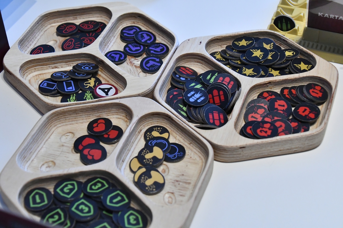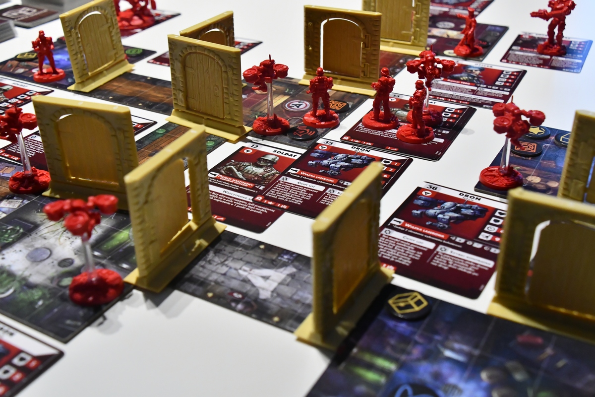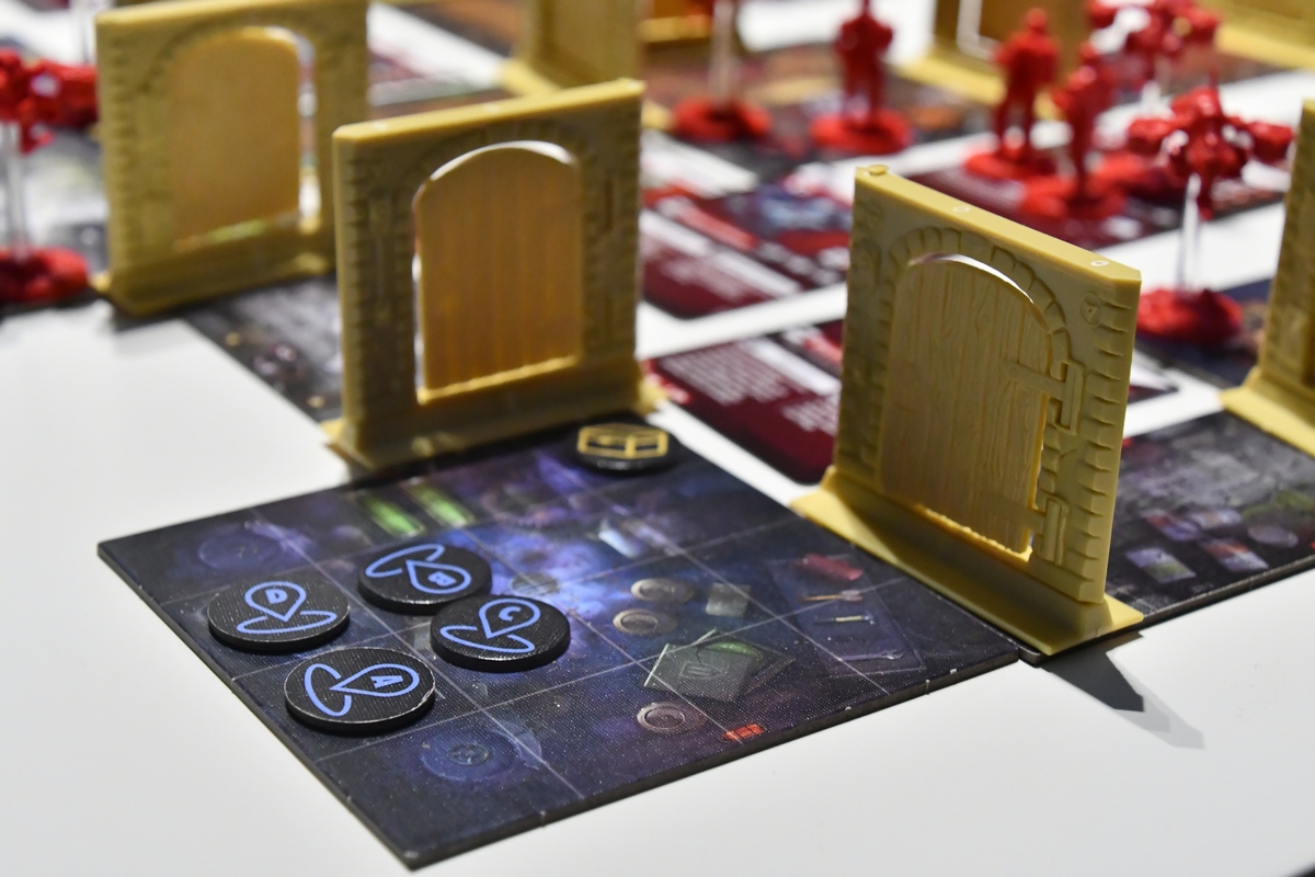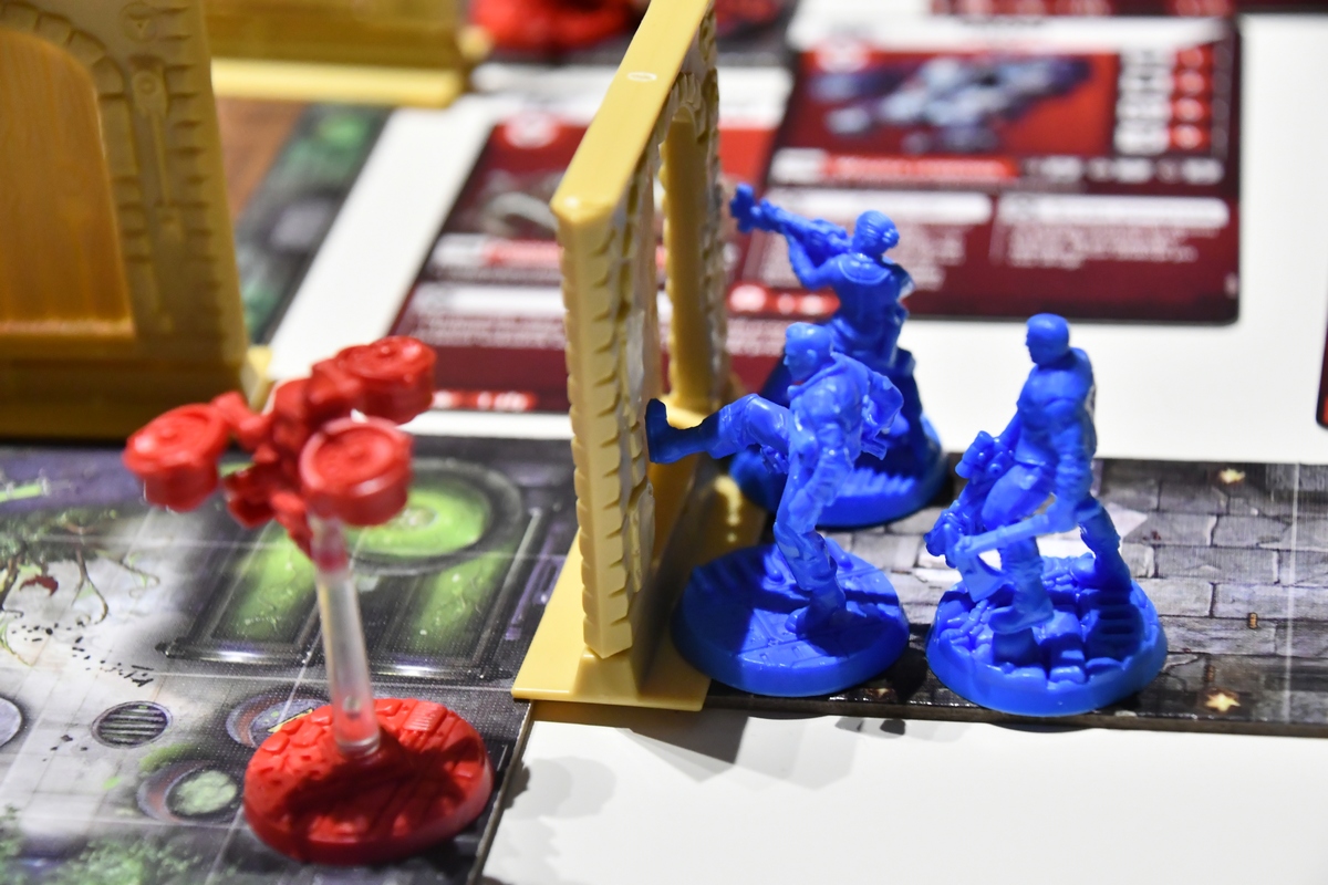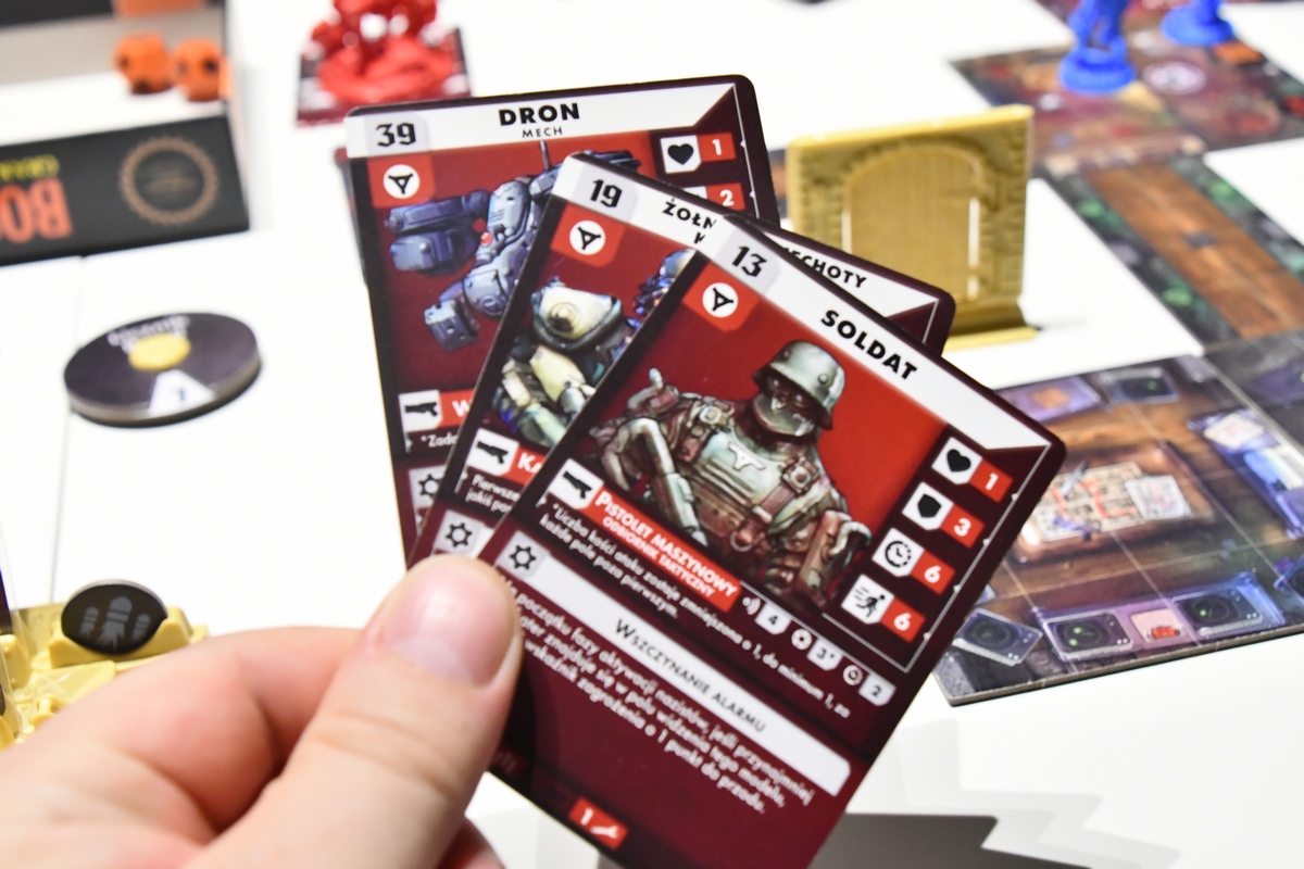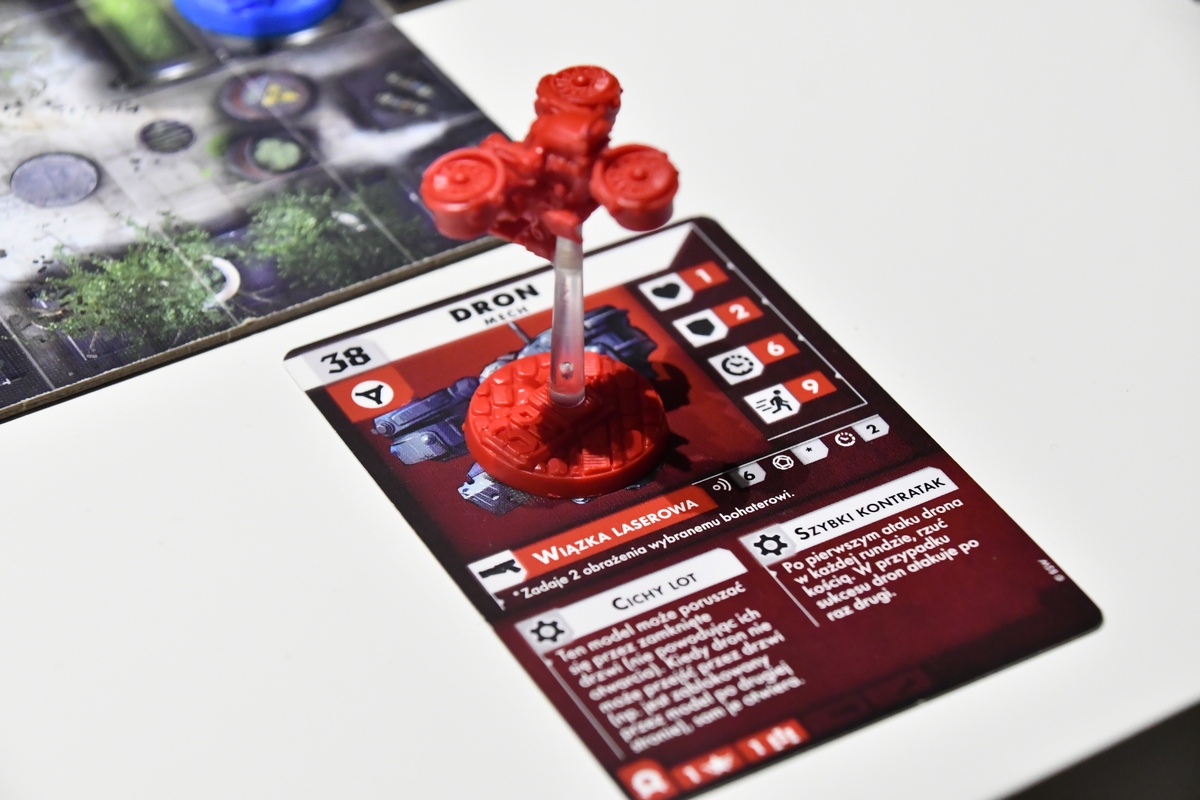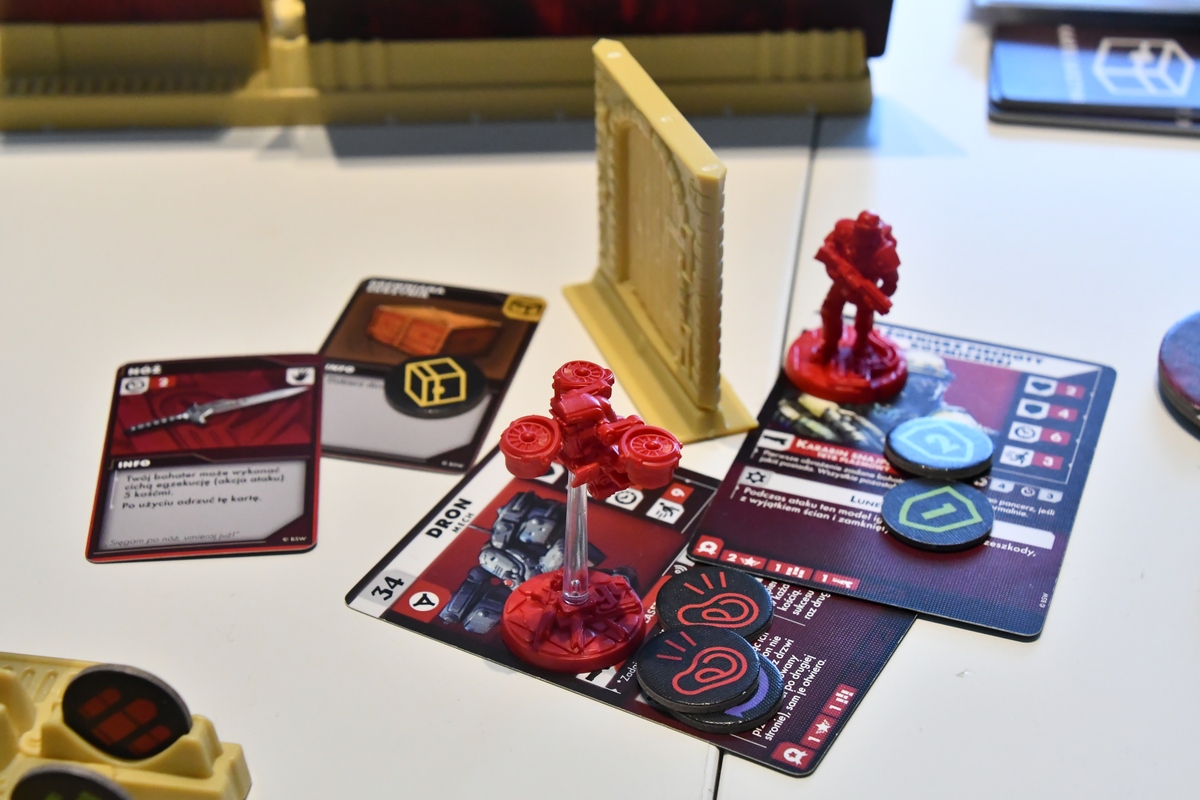 Niestety przygotowanie gry to męczarnia i trwa podobny czas jak sama rozgrywka. Przede wszystkim w pudełku jest multum figurek, które po zakupie gry należy... skleić. Przed samą rozrywką trzeba rozłożyć kafelki według scenariusza, a następnie figurki, żetony i drzwi/kraty. Dodatkowo warto przy każdej figurce umieścić kartę tej postaci, ponieważ każda postać ma nieco inne właściwości. Figurki mają słabo widoczne numery na podstawkach (wskazane w scenariuszu), natomiast nie są one ułożone tymi numerami w wyprasce, co powoduje długie poszukiwania (dopóki się nie zacznie kojarzyć). Co więcej figurka nie ma znaczenia. W praktyce można wziąć dowolną, ponieważ i tak znaczenie ma wyłącznie karta, która przy niej leży. Drugi mankament to umieszczane pionowo drzwi, które w momencie wyważenia można otworzyć. Bajer wygląda efektownie, ale drzwi zajmują pola, po których chodzą figurki (i przeszkadzają w ich ustawieniu), więc najlepiej po otwarciu po prostu zdjąć drzwi z planszy. Poza tym jest szereg kart (broni, ekwipunku, wydarzeń i skrzyń), których wielkość została dobrze przemyślana i szereg żetonów, których różnorodność przytłacza ale ikony są dosyć intuicyjne. Z ikonami na kartach jest nieco trudniej, na przykład punkty akcji symbolizuje coś w rodzaju zegara. Najwięcej czasu zajęło mi zapamiętanie symboliki na kartach broni. Wreszcie są planszetki gracza (bardzo dobrze wykonane), a mojej w wersji plastikowa podstawka na zasoby dla postaci. Dopiero w trakcie gry wychodzi, gdzie najwygodniej włożyć karty, a gdzie żetony (czasem się je wkłada pionowo, czasem kładzie). Niemniej wykonanie, różnorodność i spójność graficzna super!