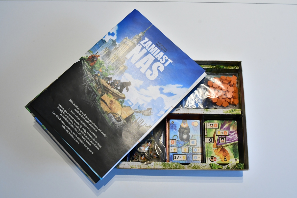 Zamiast nas to gra łącząca deck-building z zarządzaniem zasobami. Prezentuje unikatową i intuicyjną mechanikę łączenia kart dla osiągania jak najlepszych wyników. Gracze wcielą się w niej w przywódców stad małp, pozostałych na Ziemi po tym, jak ludzkość dawno już wyginęła. Zaczynając jedynie z tamarynami, łączyć będą swoje karty w wyjątkowe łańcuchy, tworząc unikalne kombinacje zasobów możliwych do otrzymania w każdej z tur. Coraz lepsze kombinacje możliwe będą dzięki przywabianiu do swojego stada nowych gatunków: potężnych goryli, sprytnych orangutanów, mądrych mandryli czy uniwersalnych szympansów. Dzięki nim oprócz gromadzenia zasobów gracze zdobędą również możliwość wykorzystywania pozostawionych przez ludzi przedmiotów, a wszystko to prowadzić będzie do zdobywania cennych punktów zwycięstwa. Gracz, który jako pierwszy zdobędzie ich 80 jako pierwszy stworzy silne plemię i zwycięży.